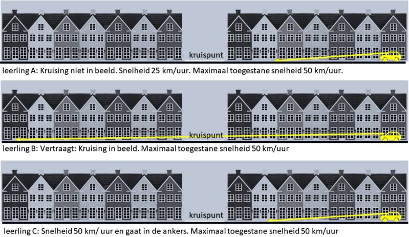 Zou ik net als leerling A bij lange na niet de maximaal toegestane snelheid rijden, lok ik deviant gedrag uit zoals inhalen wanneer het niet mag en niet kan. Google maar eens: 112 Brabant, N279, afbeeldingen.