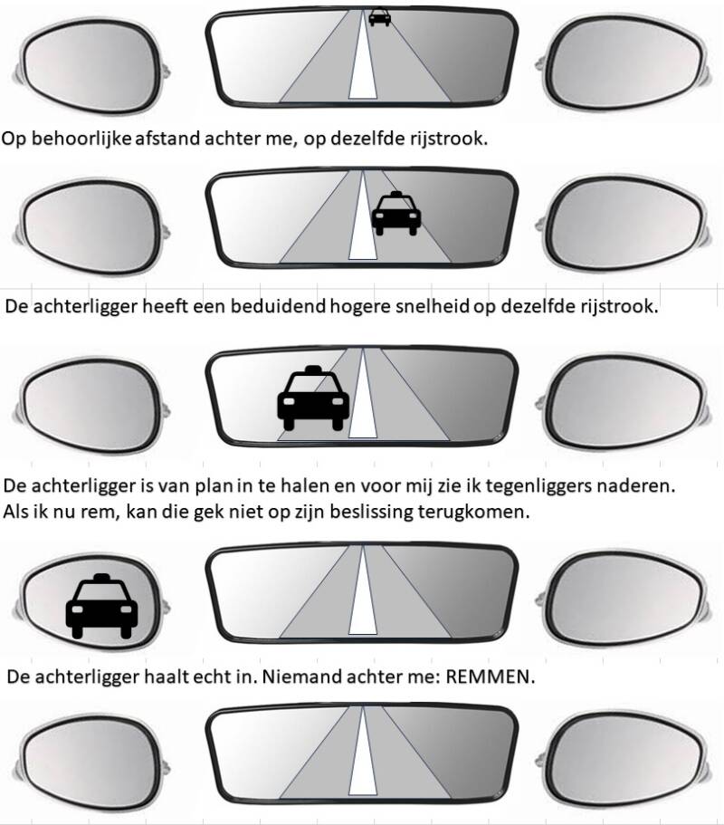 Aan het begin van de straat heb je de hele situatie voor je. Rij jij naar het einde van die straat ben jij overtuigd dat onderweg de situatie ongewijzigd is. De rijcoach spoort blijkbaar niet helemaal. Dat ze dit niet snapt? Rijcoach die spiegels heb je alleen nodig als je moet invoegen of moet rijstrook wisselen. De domme rijcoach stuurt de leerling door de straat waar de middelbare school net uit is. Arie, we gaan bij de volgende kruising linksaf. Er volgt een ingreep: Kut, niet gezien. Nee: Kut geen spiegels en dode hoek gekeken. Had je voorafgaand aan het linksaf willen slaan in de linker buitenspiegel gekeken, had je die 2 inhalende meiden achter je gezien. Had je dan ook nog over je schouder gekeken had je de dames ook nog zien appen. Heb je die spiegels alleen bij het invoegen en rijstrook wisselen nodig? Nee. De rijcoach heeft blijkbaar toch een universitair werk en denkniveau.