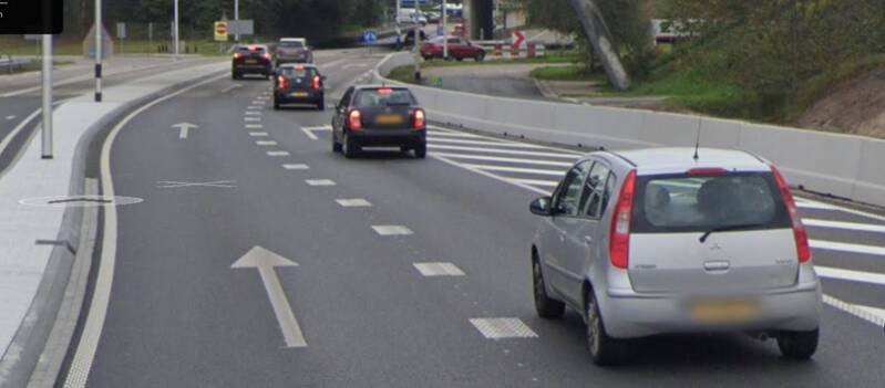 Wat kun je verwachten als je hier de meest linksgelegen strook kiest? Een wegversmalling ná een voorsorteerstrookje zolang als een potlood. Als je het omcirkelde bord niet ziet, heb je een blindengeleidehond nodig of rij je voor de zoveelste keer veel te dicht achter 12 m2 vrachtauto. Dan komt er een moment dat ik het gewoon laat gebeuren en bereid ik me voor op de stuuringreep in de bocht.