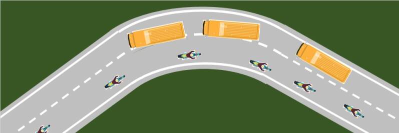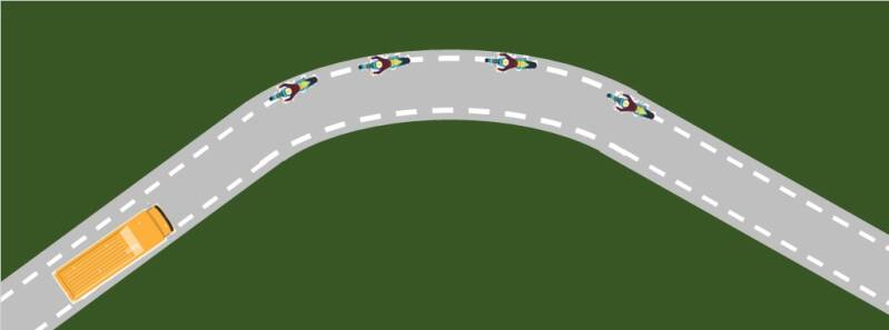 In het geval de bocht scherp naar rechts verloopt en door vegetatie en of gebouwen het onmogelijk is te voorspellen wat ná de bocht het verrassingspakket is, gebruik je jouw fantasie: Er komt mij een groot roze voertuig tegemoet en op mijn weghelft feestvierende schooljeugd op fatbikes met vieren naast elkaar.