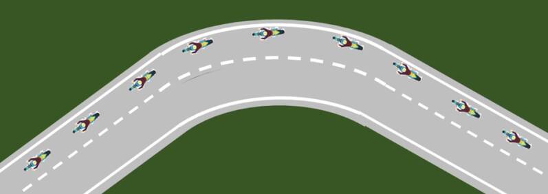 Op nevenstaande afbeelding heb je hier de ideale rij lijn om je hachje maximaal te beschermen. Het is geen wet dat elke bocht naar rechts jij links rijdt.