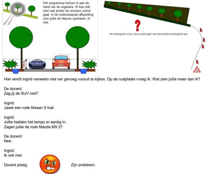 Bij het bord bocht naar links volgde ik het wegverloop en het viel me op dat een SUV maar net boven de struiken uit kwam. Heeft degene die mij verweet niet ver genoeg vooruit te kijken die SUV wel gezien? Alles wat kleiner is dan die SUV, hebben ze zeker niet gezien.