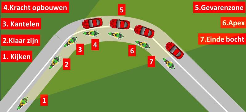 In de bocht naar links rij je altijd rechts, rekening houdend met zand, split, bladeren en andere ongerechtigdheden aan de kant van de weg waar je over uit kunt glijden. Rij vooral in een bocht niet over putdeksels, witte wegmarkeringen zoals de doorgetyrokken streep aan de zijkant. Als je in de bocht nog moet vertragen, ben je voor de bocht met een te hoge snelheid de bocht ingegaan.