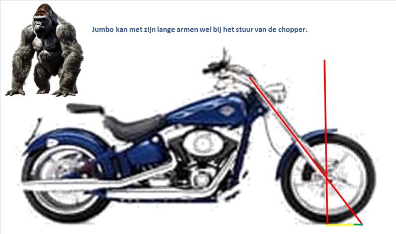 Bij een chopper kan Smurfin lekker stevig met de voetjes aan de grond, maar je gaat voor het AVB examen niet slagen a.v.g. de beduidend grotere naloop dan bij beide lesmotoren. Een naked bike zoals de lesmotor heeft een comfortabele zitpositie: Je voeten onder je kont en niet op een treeplankje ergens vóór het motorblok. Voor een chopper moet je de lichaamsbouw hebben van een gorilla. Ik heb de lichaamsbouw van een teckel. Daarom rij ik graag op de BMW R1200RT en de BMW R1250GS: Een bescheiden naloop en de voetjes onder mijn kont.